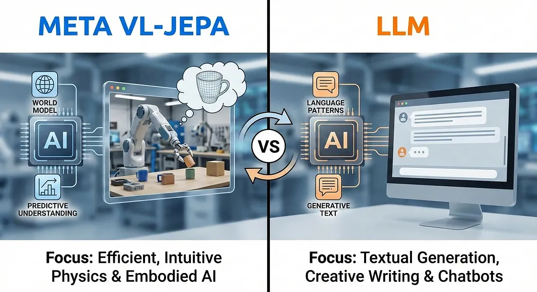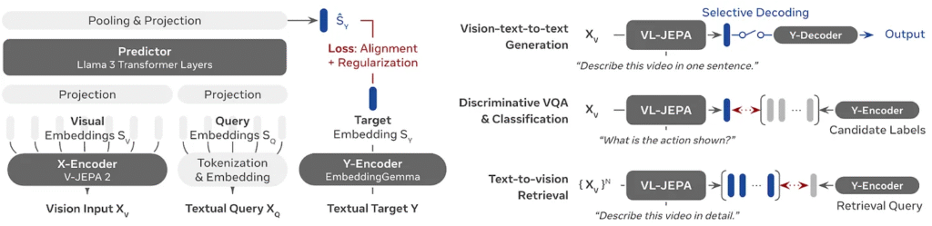 Researchers at Meta have introduced VL-JEPA, a new vision-language model built on a Joint Embedding Predictive Architecture (JEPA). Unlike traditional vision-language models that generate text token by token, VL-JEPA learns by predicting abstract representations of the world. This design shift makes VL-JEPA both more efficient and more capable. Despite using only about half the trainable parameters of comparable models, it delivers stronger performance across a wide range of tasks. More importantly, VL-JEPA supports diverse applications without requiring architectural changes, marking a fundamental move away from token generation toward genuine representation learning and physical world modeling.