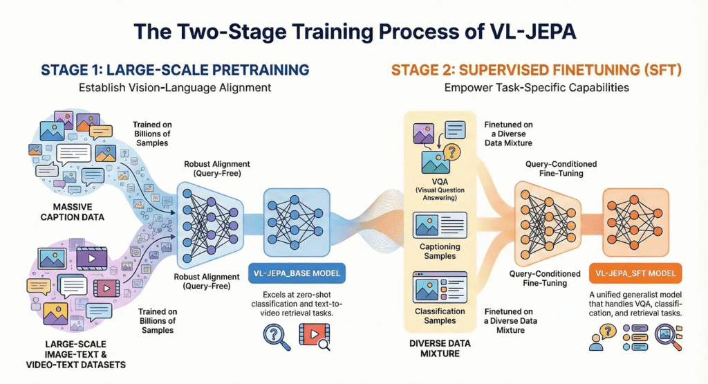 In the first stage, the model learns broad vision-language alignment using large-scale image-text and video-text datasets. This produces VL-JEPA_BASE, which excels at zero-shot tasks such as video classification and retrieval.
